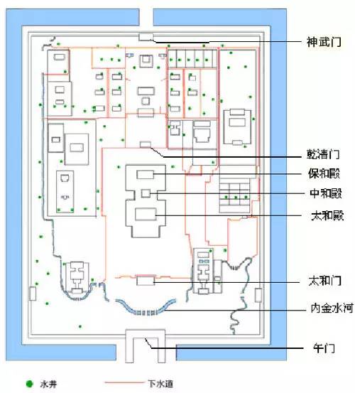 紫禁城排水系統(tǒng)總體規(guī)劃是東西方向的雨水匯入南北干溝,然后流入內(nèi)金水河。各個(gè)宮殿院落均設(shè)有干溝、支溝、明溝、暗溝、涵洞、流水溝眼等眾多排水設(shè)施。