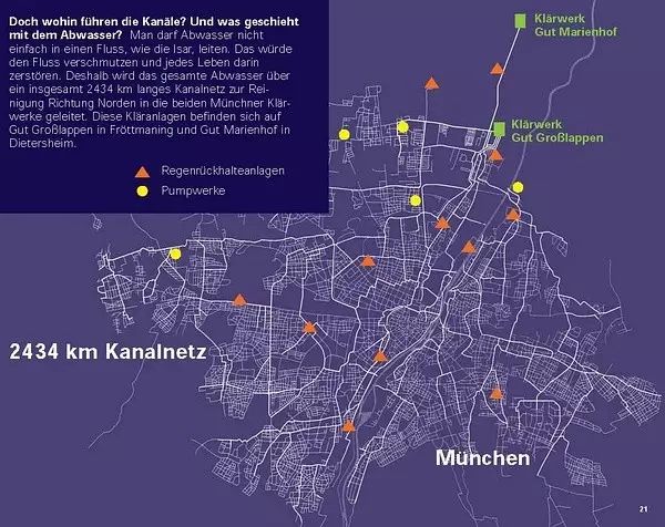 慕尼黑的市政排水系統(tǒng)的歷史可以追溯到1811年,當(dāng)時(shí)的執(zhí)政官Karl Probst修了一條20公里的陰溝渠,將污水引向了Isar河。后來(lái)經(jīng)過(guò)幾代人的發(fā)展,到了二戰(zhàn)前,慕尼黑市政排水有了里程碑式的發(fā)展,第一個(gè)污水處理廠(chǎng)Gut Groβlappen在慕尼黑建成。而到了1989年,慕尼黑市的第二個(gè)污水處理廠(chǎng)Gut Marienhof落成?,F(xiàn)在是慕尼黑現(xiàn)在最大最重要的污水處理設(shè)施。